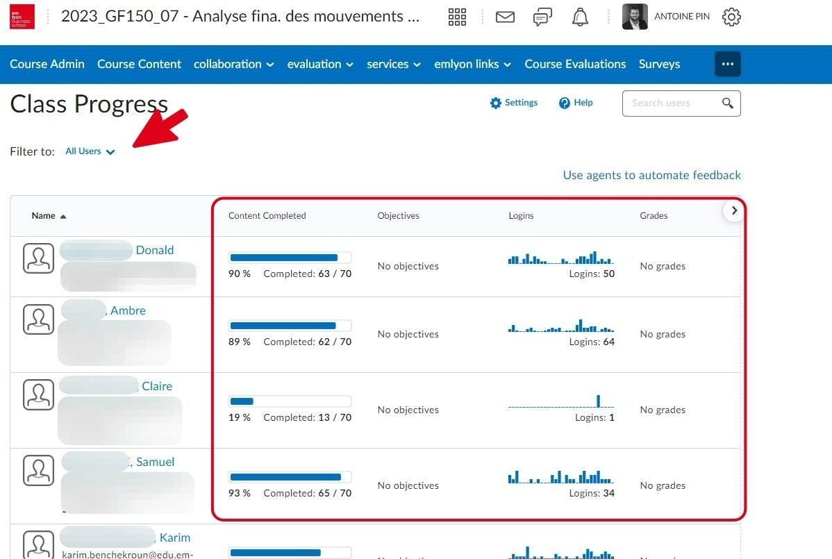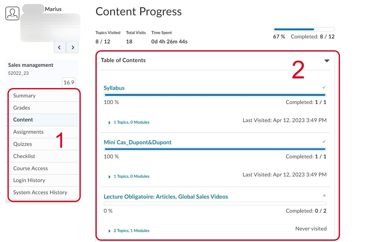 In zone 1 : you'll find all the activities linked to your participants by tool. In our case, we've clicked on Content Progress.