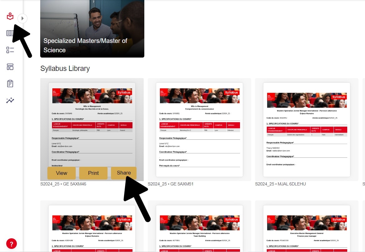 Scroll down to find the syllabus you wish to download, hover your mouse over it and then click on the "Share" button that appears.