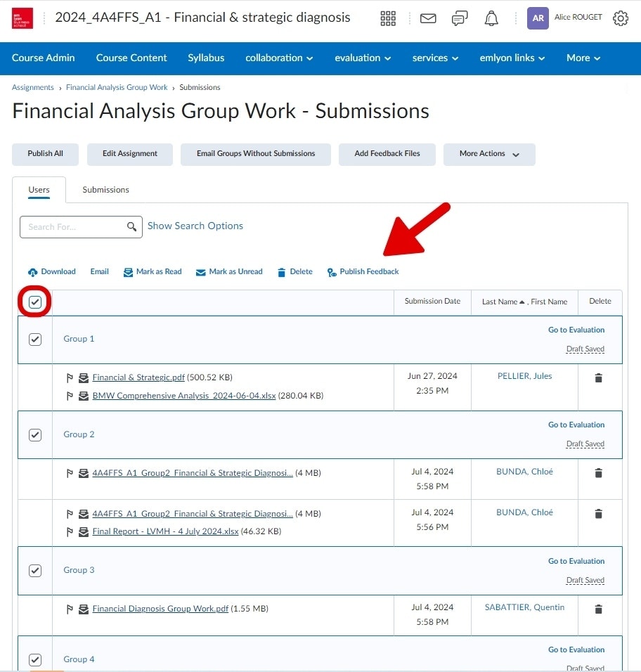 Select all the assignments for which you wish to publish a grade (to select them all at once, click on the box in the top left-hand corner, making sure that all assignments are displayed on the same page).