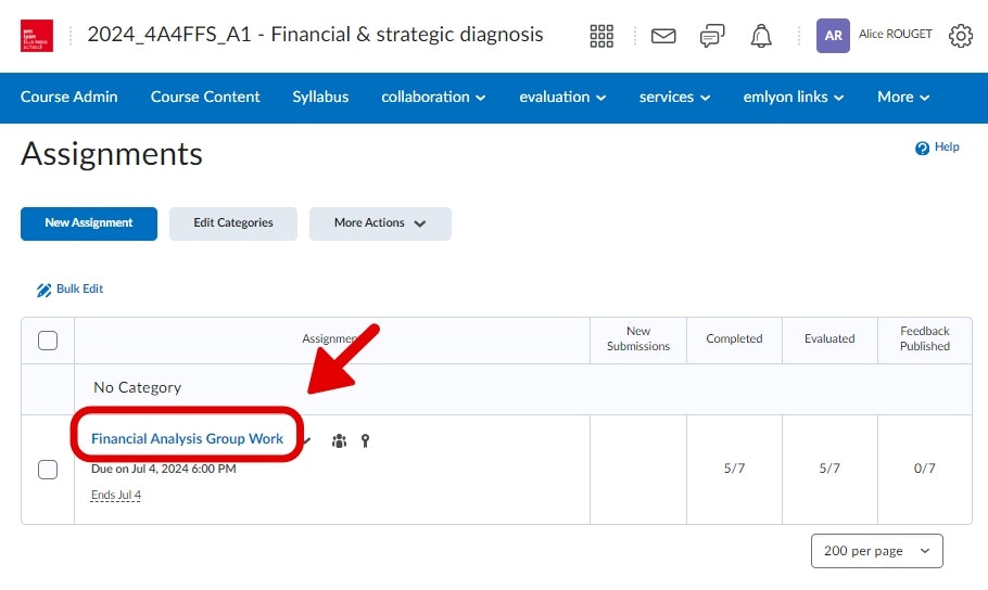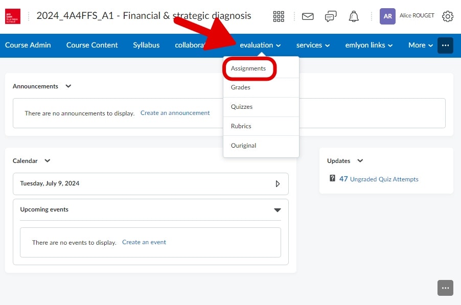 To view and grade assignments stored in a Dropbox (individual or collective), click on Evaluation > assignment.