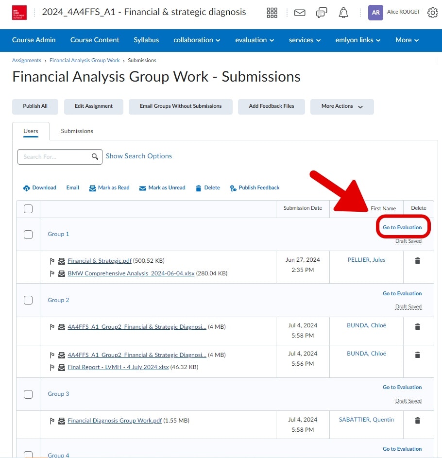Click on "Go to evaluation" next to the group/student you wish to assess.
