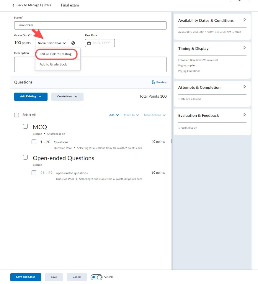 Click on the " Not in Grade Book " button (or "In Grade Book" if your quiz is already linked to an item in the gradebook but you want to modify it) then "Edit or link to existing" .