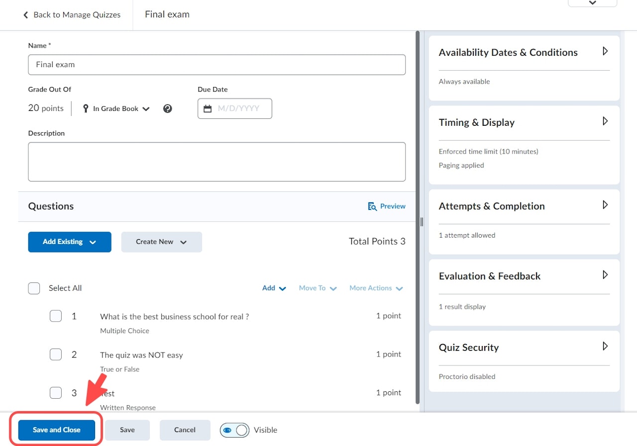 If you have no further changes to make to your quiz, click on " Save and close ".