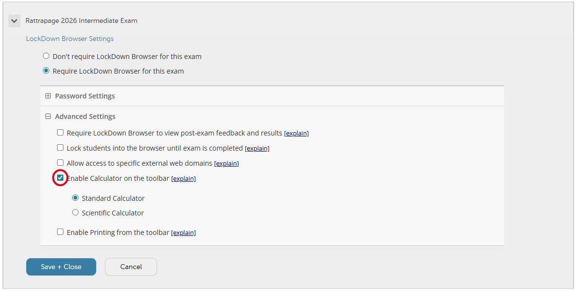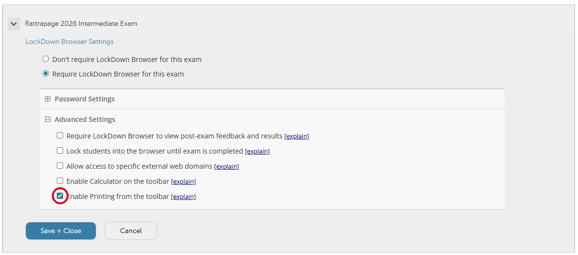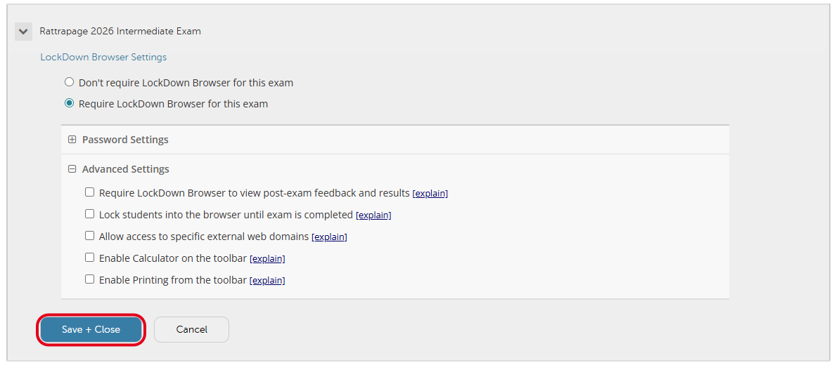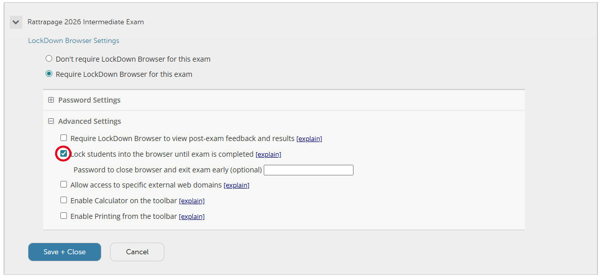 In case of an emergency or technical problem, by checking this setting you have the option to enter a password that will allow you to close the browser. The student will then exit the browser lock, the exam will close, and it will not be submitted. The student will then have access to the exam again.