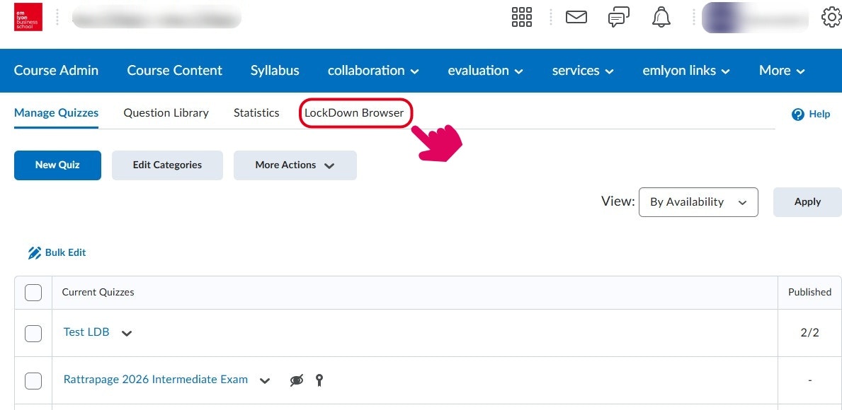 In the course, on the blue banner, click on evaluation, open the Quiz tab, you now have access to the LockDown Browser dashboard.