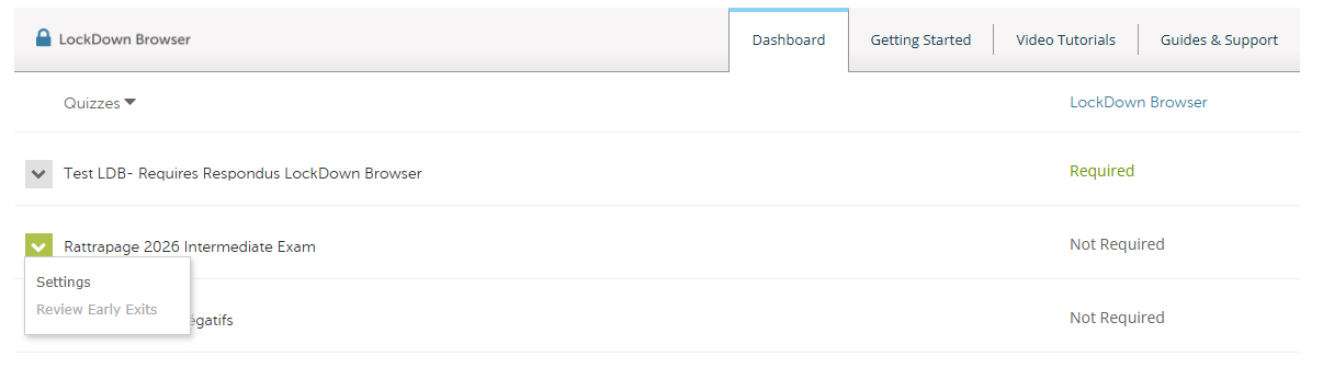 To verify that Lock Down Browser has been installed on the quiz, you can check in the menu that " Requires Respondus Lockdown Browser " appears after the quiz name and "Required" in green, on the right, as shown below:
