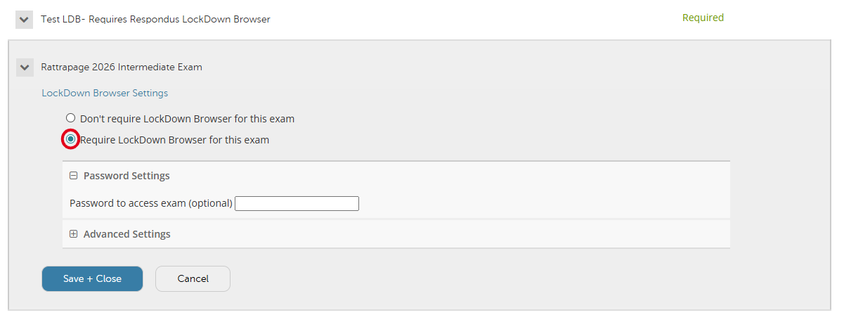 1st quiz: The instruction after the quiz name "Test LDB", Requires Respondus Lockdown Browser, requires that students use LockDown Browser.