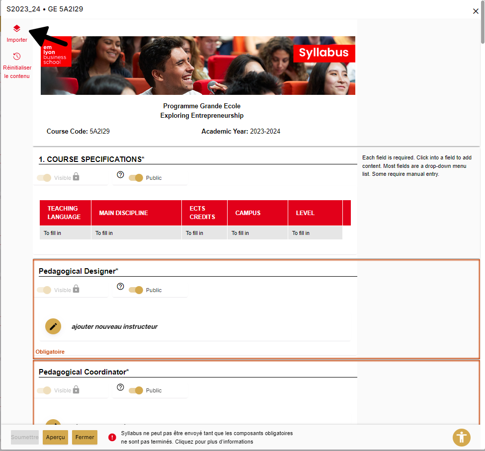 1.Pour importer le syllabus de lâannĂ©e prĂ©cĂ©dente, cliquez sur « Importer ».