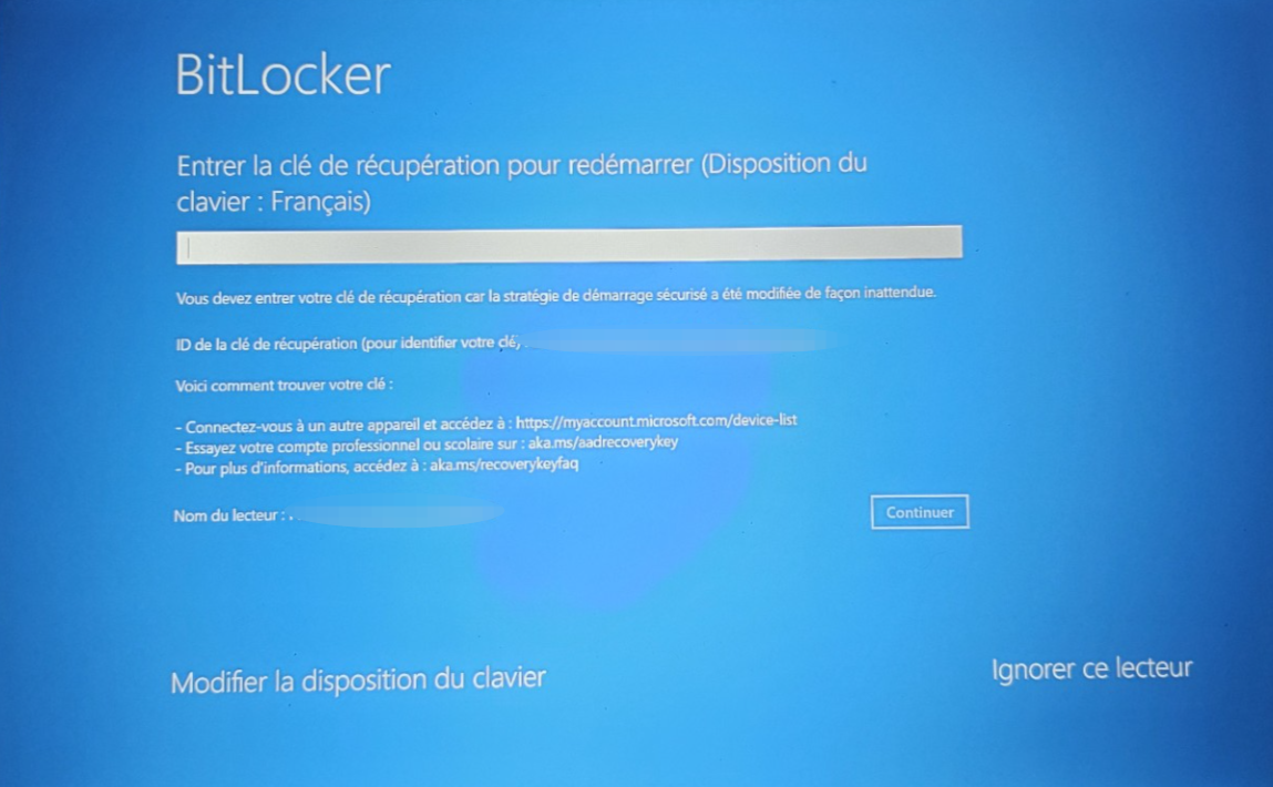 En démarrant votre poste, il est possible qu'un écran indiquant une demande de clé de récupération empêche son démarrage.