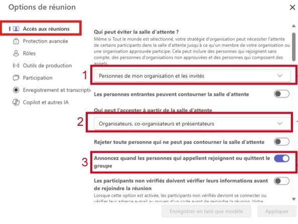 La troisième configuration permet d'annoncer les personnes rejoignant ou quittant une réunion en cours.