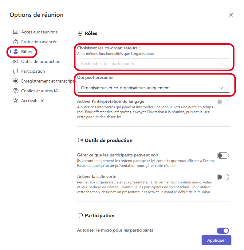 La première configuration permet l'ajout de co-organisateurs sur votre réunion.