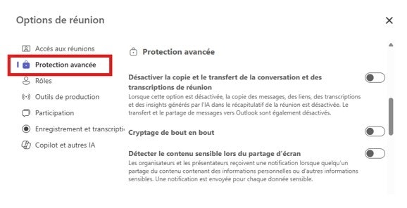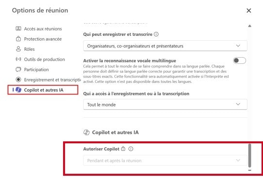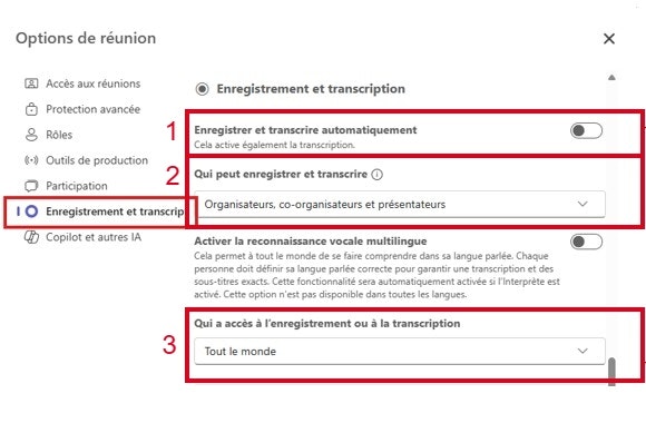 La première option permet de configurer par défaut l'enregistrement et la transcription automatiques au lancement de la réunion.