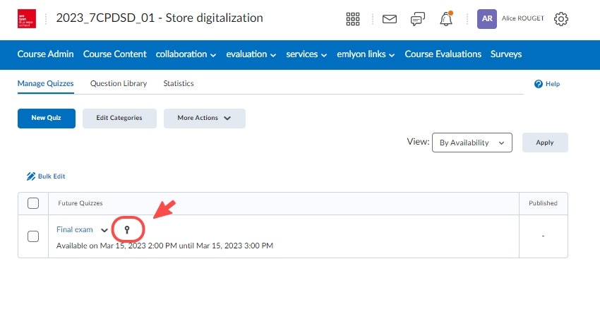 Le marqueur "médaille" prouve que votre quiz est relié à un élément du gradebook.
