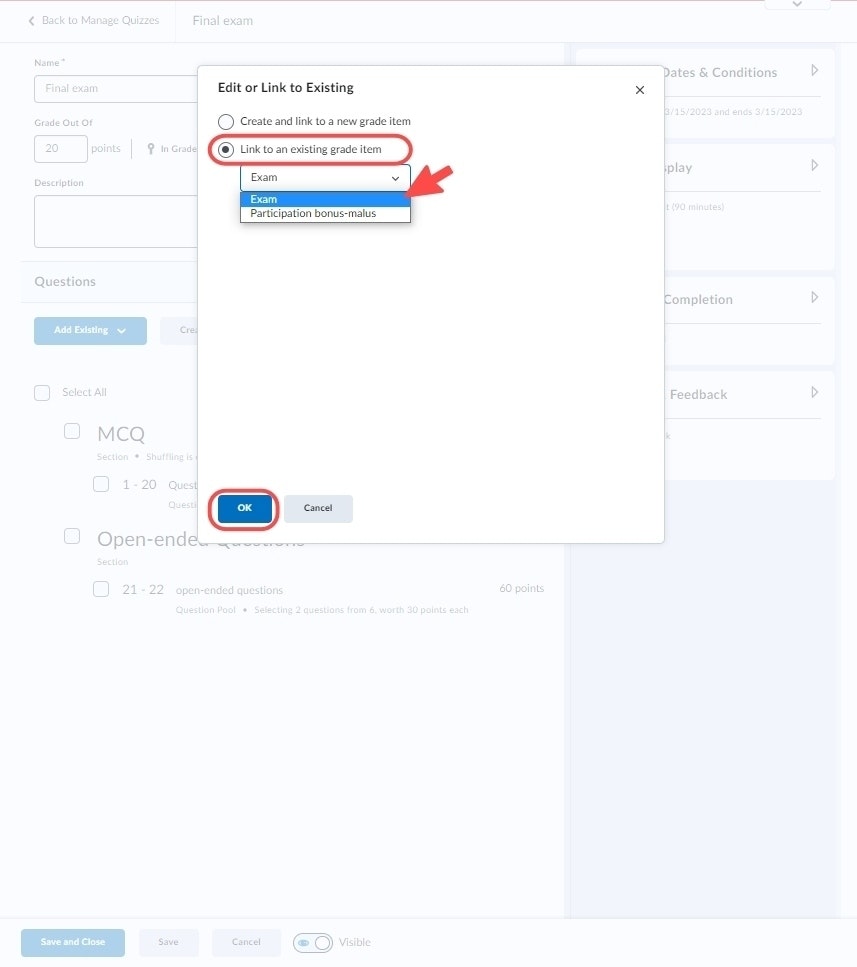 Sélectionnez "Link to an existing grade item" puis choisissez l'élément correspondant à votre quiz.