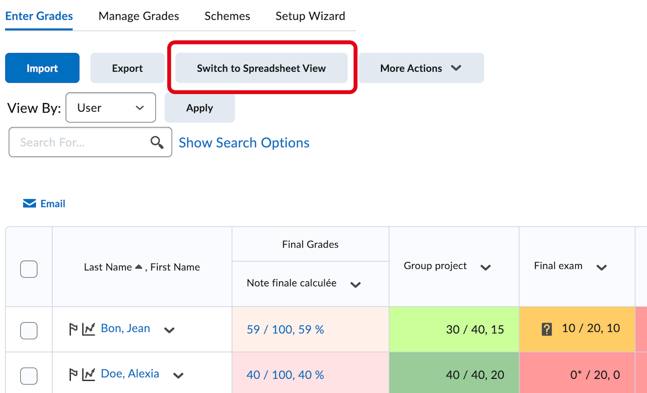 Une fois dans le gradebook, cliquez sur "Switch to Spreadsheet view"